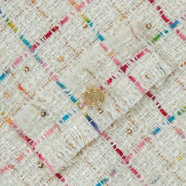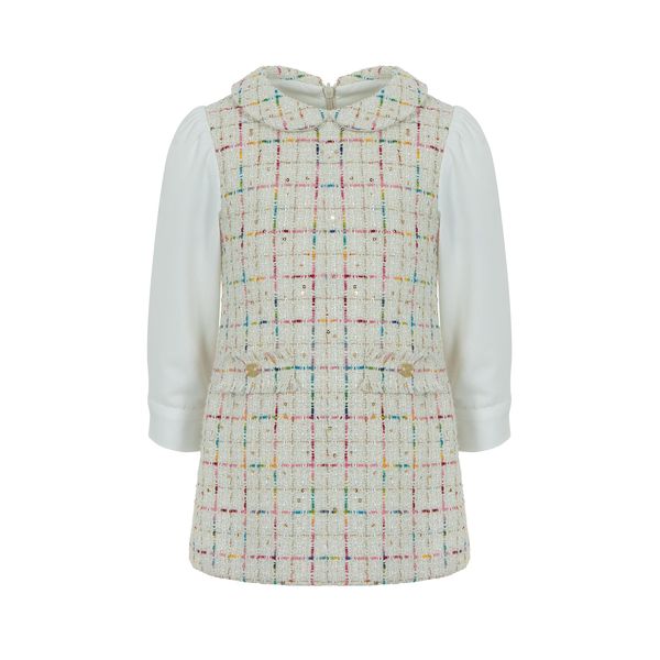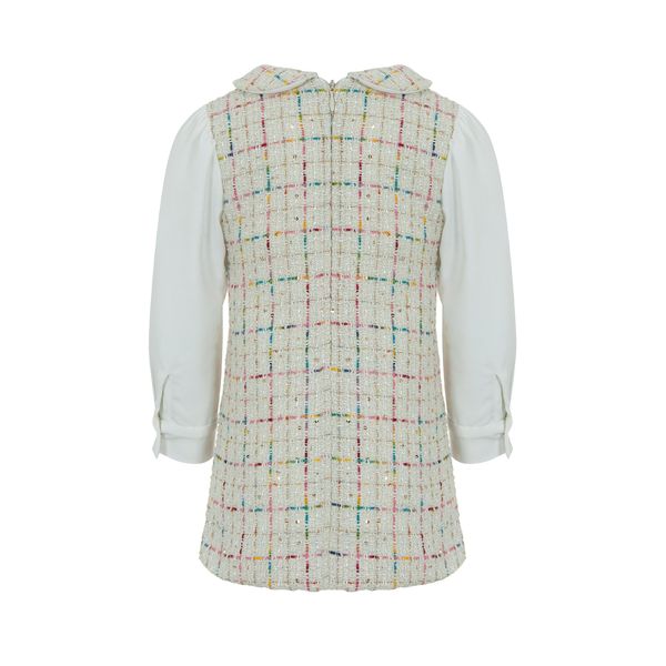 A beautiful dress set from lapin house in a beautiful cream tweed dress with peter pan colour with an array of colours of fine stitching, finished with 2 gold buttons to create pockets to the front, attached is a ivory blouse with gold buttons to the cuffs.