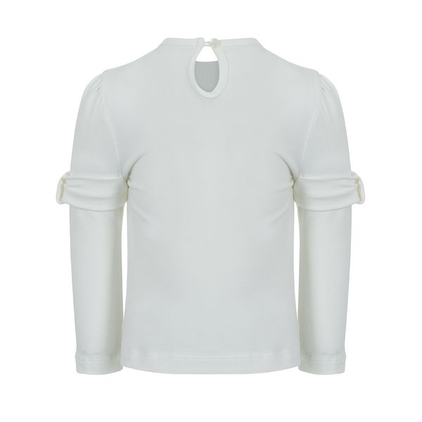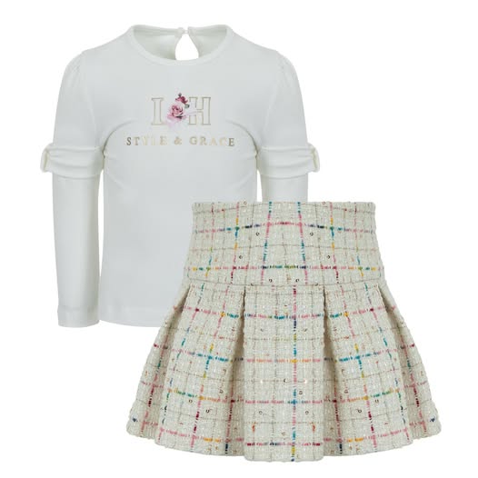 A striking Ivory long sleeve polo with ruffle detail to sleeve, A soft tweed pleated skirt, with an array of different coloured stitching zip fastening and adjustable waistline for extra comfort.