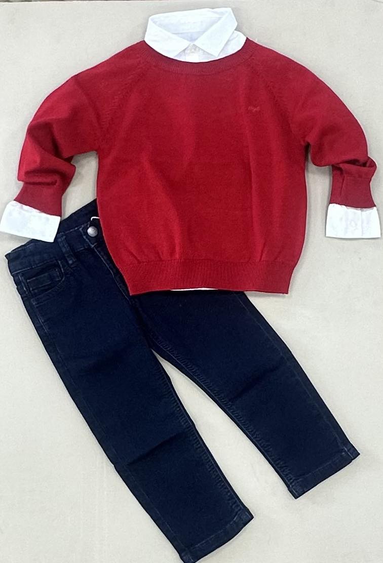 Mayoral Boys Red Knitted Sweater With White Shirt And Denim Jeans