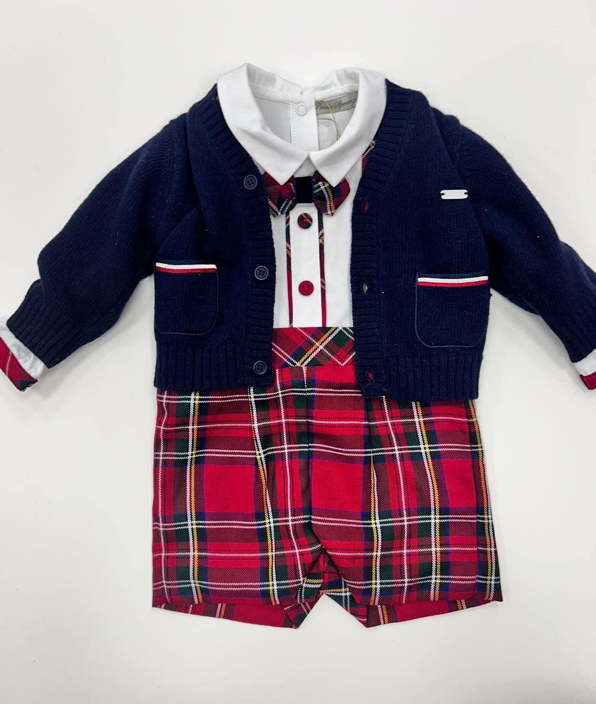 Dress your little gentleman in timeless elegance with this beautifully coordinated outfit from Piccola Speranza. A Crisp white collared shirt with tartan buttons and matching bow tie, traditional tartan red, green and yellow suspended shorts, finished with a navy blue knit cardigan with red and white trim on the pockets and sleeves, finished with front button fastening and a decorative crest pin.
